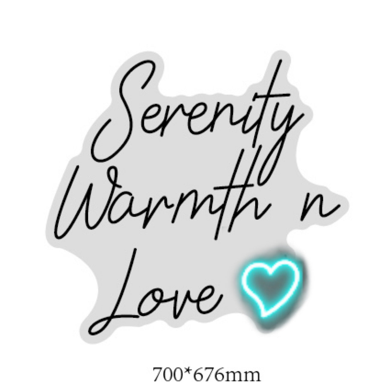 Text: Serenity Warmth n Love (over three lines) Custom LED Neon Sign - Size: 70cm x 67cm - Colour: Light Pink Text and Ice Blue love heart - Font: As per image - Cut to Shape - Need Battery Pack - Wall mounting accessories - Need by 3 June 2025